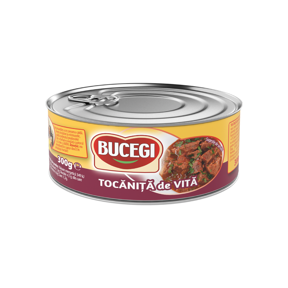 Tocăniță de vită. Produs sterilizat. Ingrediente: apă, carne de vită 40% (carne de vită, apă, amidon din porumb), roșii în suc de roșii, ulei de floarea-soarelui, amidon modificat din porumb, ceapă, sare, amidon din porumb, usturoi, piper, boia de ardei dulce, frunze de pătrunjel, cimbru.