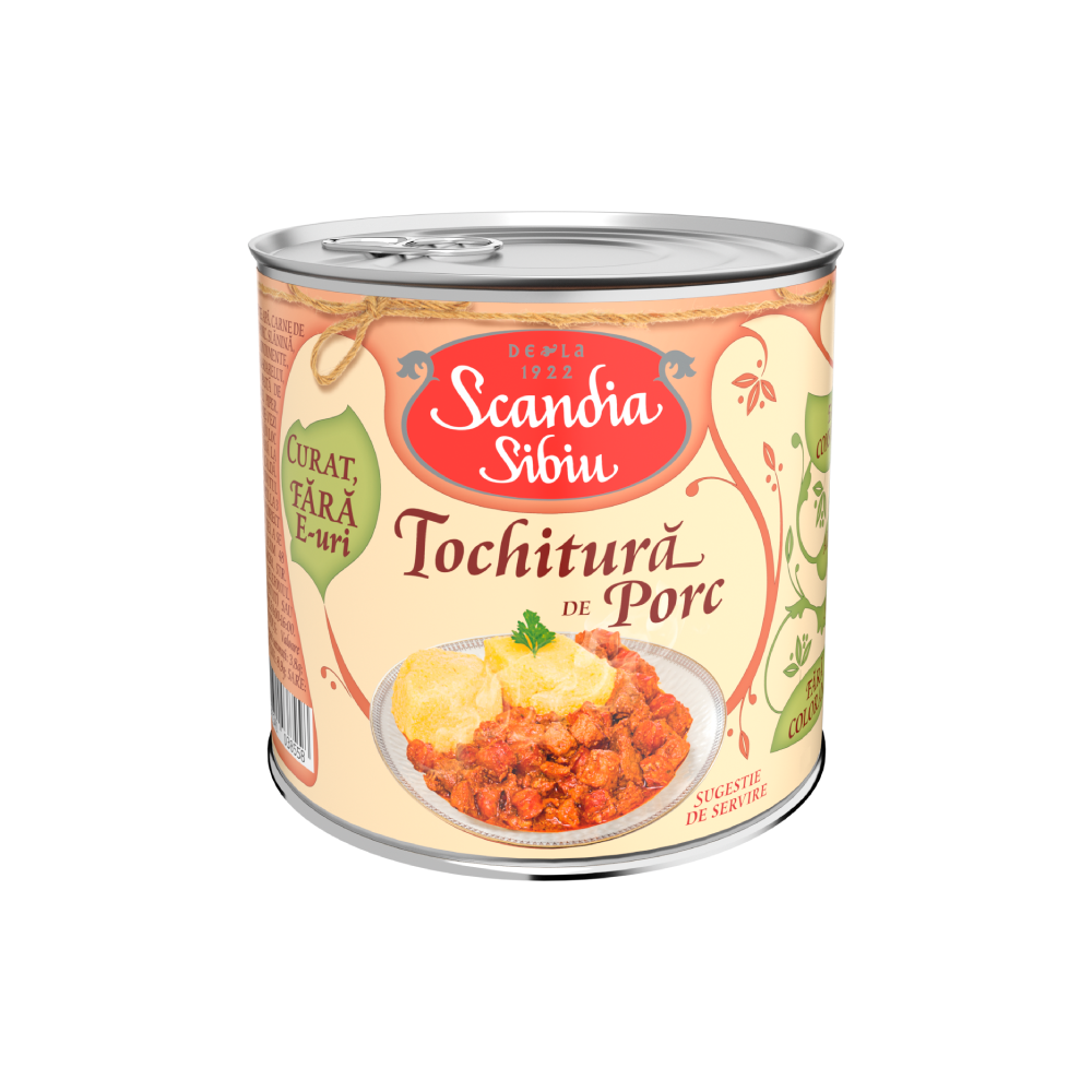 Tochitură de porc. Produs sterilizat. Ingrediente: carne de porc 30%, apă, cârnaţi de porc afumaţi 20% (carne de porc, slănină, proteină vegetală din soia, sare, condimente, usturoi, membrane naturale), ulei de floarea-soarelui, roșii în suc de roșii, amidon din porumb, ceapă, pastă de tomate, sare, usturoi, boia de ardei, piper, cimbru. Alergeni: soia.
